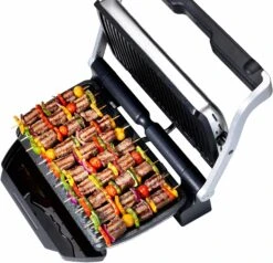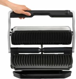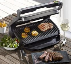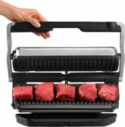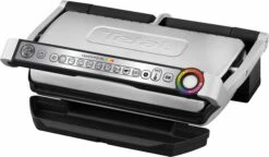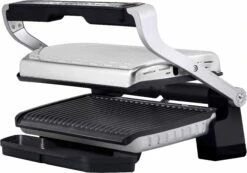 De OptiGrill levert dankzij de exclusieve technologie perfecte grillresultaten, geheel naar eigen smaak! De grilltemperatuur en de grillcycli passen zich al naargelang de dikte en soort van het grillhapje automatisch aan. Via een lichtindicator wordt de gaartoestand van het vlees getoond. <br><br><b>Speciale eigenschappen: </b><br><ul> <li>Een 33% groter grilloppervlak ten opzichte van de klassieke Optigrill biedt ruimte aan maaltijden voor maximaal 8 personen. In de handmatige modus kunnen vier temperatuurniveaus ingesteld worden om fruit en groente optimaal te kunnen grillen. Met de drie voorgeprogrammeerde grillprogramma's lukken zeevruchten, varkensvlees en ontbijtspek nog beter en eenvoudiger.</li></ul><b>Overige specificaties: </b><br><ul> <li>Akoestische en visuele signalen tijdens het grillen en de automatische warmhoudfunctie na het grillen bieden extra comfort.</li><li>9 voorgeprogrammeerde grillprogramma's: burgers, rood vlees, sandwiches, worstjes, vis, gevogelte, zeevruchten, varkensvlees en ontbijtspek.</li><li>2 extra programma's: ontdooifunctie en handmatig (met 4 instelbare temperatuurniveaus voor de bereiding van fruit en groente)</li><li>De grillplaat heeft een hellingshoek van 7°. Dit zorgt voor een eenvoudige vetafvoer. Daarnaast zijn zowel de grillplaat als de extra grote sapcontainer geschikt voor de vaatwasser.</li></ul><b>Kenmerken en functies: </b><br><ul> <li>Apparaattype: elektrisch grillapparaat</li><li>Temperatuurkeuze: verschillende grillprogramma's waaruit je kunt kiezen</li><li>Thermostaat: automatische aanpassing van de grilltemperatuur</li><li>Grilloppervlak met antiaanbaklaag: ja</li><li>In hoogte verstelbaar: nee</li><li>Vetafvoer: ja</li><li>Snoeropwikkeling: nee</li><li>Uitneembare bladen: ja</li><li>Oververhittingsbeveiliging: ja</li><li>Snoerlengte (cm): 120</li><li>Automatische uitschakeling: ja</li></ul><b>Extra functies: </b><br><ul> <li>Het bedieningsmenu aan de handgreep zorgt voor betere bediening en zichtbaarheid.</li></ul><b>Accessoires: </b><br><ul> <li>Incl. hoogwaardig receptenboek en Quick Start-gids</li></ul><b>Technische gegevens: </b><br><ul> <li>Vermogen (W): 2000</li><li>Grilloppervlak bxl (cm): 20 x 40</li><li>Kleur: zwart/geborsteld edelstaal</li><li>Afm. apparaat hxbxd (cm): 22,9×37,5×48,1</li><li>Gewicht (kg): 7,2 kg</li><li>Gebruiksaanwijzing in: DE</li><li></li></ul>