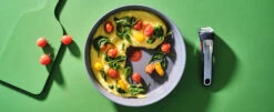 Je neemt de kunststof handgreep af voordat je de pan in de oven zet, zodat hij niet smelt.