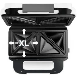 Met de Tefal Snack XL Sandwich Maker SW7011 bereid je rijkelijk belegde sandwiches en tosti’s, dankzij de extra grote platen. De platen zijn groter en dieper dan standaard platen. Hierdoor beleg je je brood met al je favoriete ingrediënten en gebruik je elk soort brood. De contactgrill beschikt over een vergrendeling. Door de grill te vergrendelen druk je het brood goed tegen elkaar en warmt het egaal op. Je wisselt de platen gemakkelijk om met de meegeleverde wafelplaten. Zo maak je ook heerlijke verse wafels. De uitneembare platen reinig je eenvoudig in de vaatwasser. Je bergt de contactgrill vervolgens verticaal op, waardoor je ruimte bespaart in je kast.