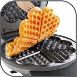 Wafelijzer voor 5 lekkere hartvormige wafels. Extra grote bakvorm met 20 cm diameter. Vetarm bakken dankzij de platen met excellente antiaanbaklaag: eenvoudig uitneembaar en gemakkelijk schoon te maken! <br><br><b>Speciale eigenschappen: </b><br><ul> <li>5 knapperige, luchtige wafels in hartmodel! Extra grote bakvorm: 20 cm diameter</li></ul><b>Overige specificaties: </b><br><ul> <li>Regelbare thermostaat: regelschuif voor traploos instelbare bruiningsgraad</li><li>Eenvoudig te reinigen dankzij blinde scharnier met antikleeflaag en grote opvangplaat voor vet en deeg</li><li>Behuizing van edelstaal: voldoet aan de nieuwe, verscherpte EU-veiligingsnormen voor oppervlaktetemperatuur (A13)</li><li>Extra grote warmte-isolerende handgreep voor veilige bediening</li></ul><b>Kenmerken & functies: </b><br><ul> <li>Antiaanbaklaag: ja</li><li>Controlelampje: ja</li><li>Temperatuurregelaar: ja</li><li>Snoeropwikkeling: ja</li><li>Bruiningsgraden: traploos</li><li>Aantal bladen: 1</li><li>Geluidssignaal: nee</li><li>Display: nee</li></ul><b>Extra functies: </b><br><ul> <li>Warmte-isolerende handgreep, verticale opslag mogelijk, oververhittingsbeveiliging</li></ul><b>Technische gegevens: </b><br><ul> <li>Vermogen (W): 1000</li><li>Aansluiting (W/ V): 1000 W / 230 V</li><li>Afm. apparaat hxbxd (cm): 30,0 x 11,8 x 22,8</li><li>Gewicht (kg): 2,15</li><li>Kleur: edelstaal mat geborsteld / mat-zwart</li><li>Gebruiksaanwijzing in: FR/DE/EN/NL/HU/SK/CS/PL/BG/HR/RO/SL/DA/NO/FI/SV/ET/LV/LT</li></ul>